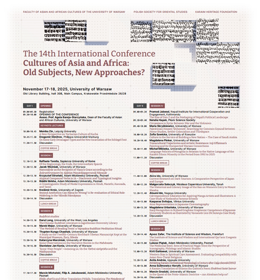 Wydział Kultur Azji i Afryki UW serdecznie zaprasza Państwa na 14. Międzynarodową Konferencję “Cultures of Asia and Africa: Old Subjects, New Approaches?” organizowaną wspólnie z Polskim Towarzystwem Orientalistycznym i Fundacją Karaimskie Dziedzictwo w dniach 17-18 listopada 2025 r. (Kampus Główny UW przy Krakowskim Przedmieściu 26/28, Stary BUW, sala 308).
